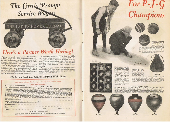 Et puis, rien de tel qu'une bonne carotte pour faire avancer le baudet ! Alors Curtis proposait des cadeaux à tous ses vendeurs, en fonction de leur ventes. J'ai récupéré quelques catalogues de cette époque, et vous verrez que chaque vendeur pouvait trouver son compte dans ces objets proposés par l'éditeur...